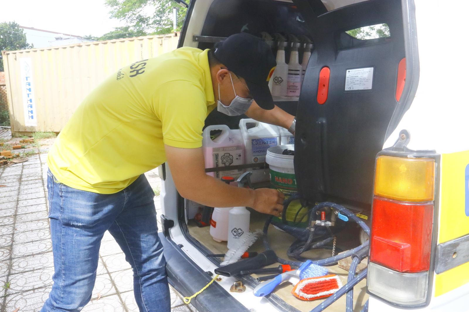 Theo anh Phong, máy móc và thiết bị đều được trang bị trong một chiếc xe ô tô tiện lợi có thể di chuyển thoải mái đến tận nhà khách hàng khi được yêu cầu. Trong chiếc xe lưu động gồm có 1 máy rửa xe hơi nước nóng có thể tự tạo áp, tạo nhiệt độ để rửa, một máy phát điện phục vụ bình hơi, khí nén, máy rửa xe và một máy hút bụi cùng với các đồ nghề, dụng cụ khác.