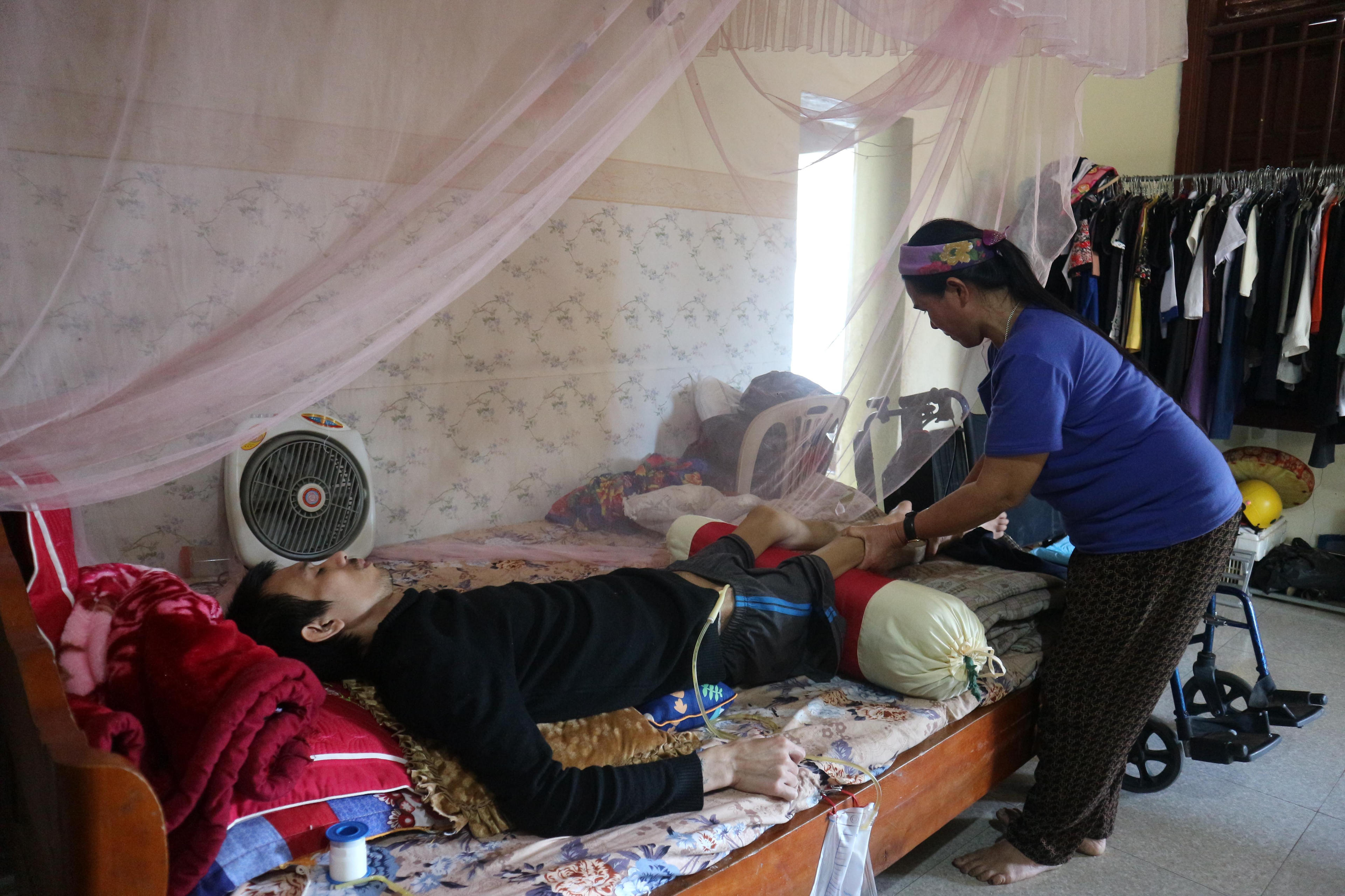 Trời gần trưa, bà Công tất bật bỏ chợ, chạy về nhà thay băng gạc cho con. Các công việc như thay bỉm, rửa vết lở, bôi thuốc...đều được bàlàm thông thạo. “Khổ mấy tôi cũng chịu đựng được, những mong sao con khỏe mạnh, sống tích cực. Thế nhưng, chi phí thuốc men, băng gạc cho con mỗi tháng lên đến gần 15 triệu đồng là quá nặng đối với một gia đình làm nông, đông con như chúng tôi...”, bà Công bỏ ngỏ câu nói ấy.