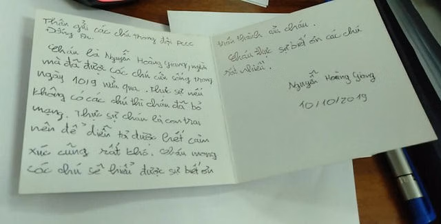 Trong bức thư gửi các chú cảnh sát PCCC, Nguyễn Hoàng Giang nắn nót viết từng chữ với sự trân trọng, biết ơn sâu sắc. “Thân gửi các chú trong đội PCCC Đống Đa. Cháu là Nguyễn Hoàng Giang, người mà đã được các chú cứu sống trong ngày 10/9 vừa qua. Thực sự nếu không có các chú thì cháu đã bỏ mạng. Cháu là con trai nên để diễn tả được hết cảm xúc của mình rất khó. Cháu mong, các chú sẽ hiểu được sự biết ơn chân thành của cháu. Cháu thực sự cảm ơn các chú rất nhiều”.