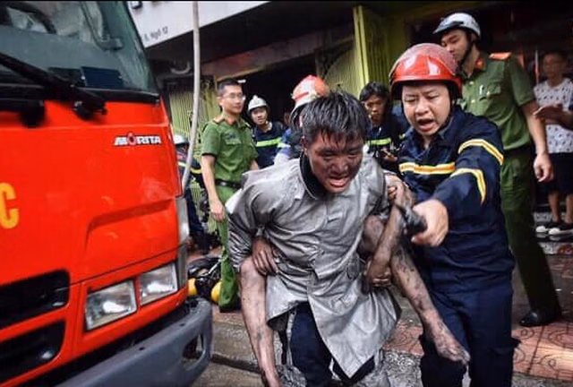 Khoảnh khắc chiến sỹ cảnh sát Ngọc Hoàng người lấm lem khói đen, cõng nạn nhân thoát khỏi đám cháy được anh Viết Thành chia sẻ trên trang cá nhân với sự biết sơn sâu sắc. Ảnh chụp màn hình
