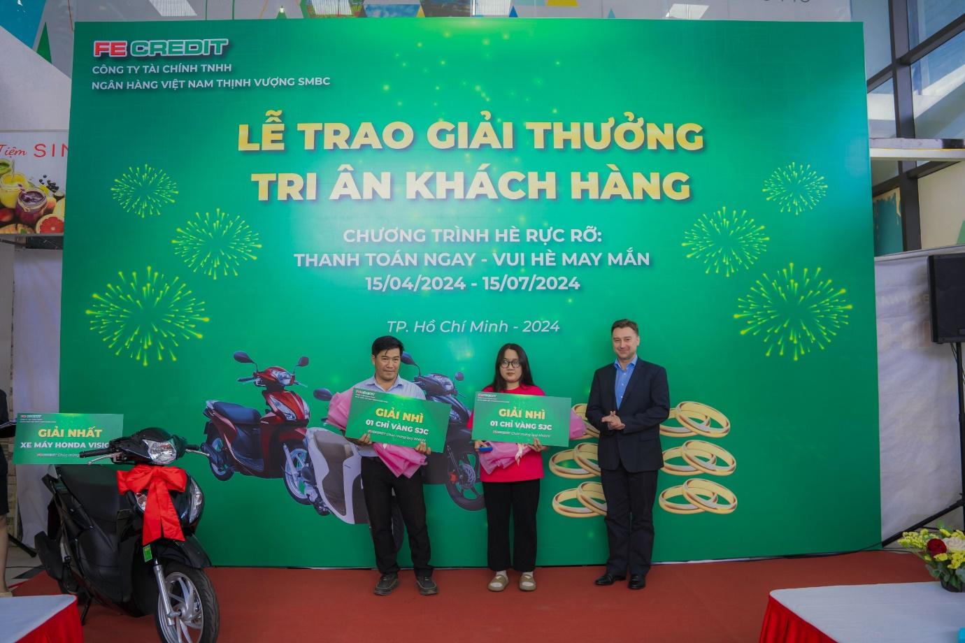 Đại diện FE CREDIT trao giải nhất là một chiếc Honda Vision cho khách hàng may mắn trúng thưởng. Ảnh: FE CREDIT
