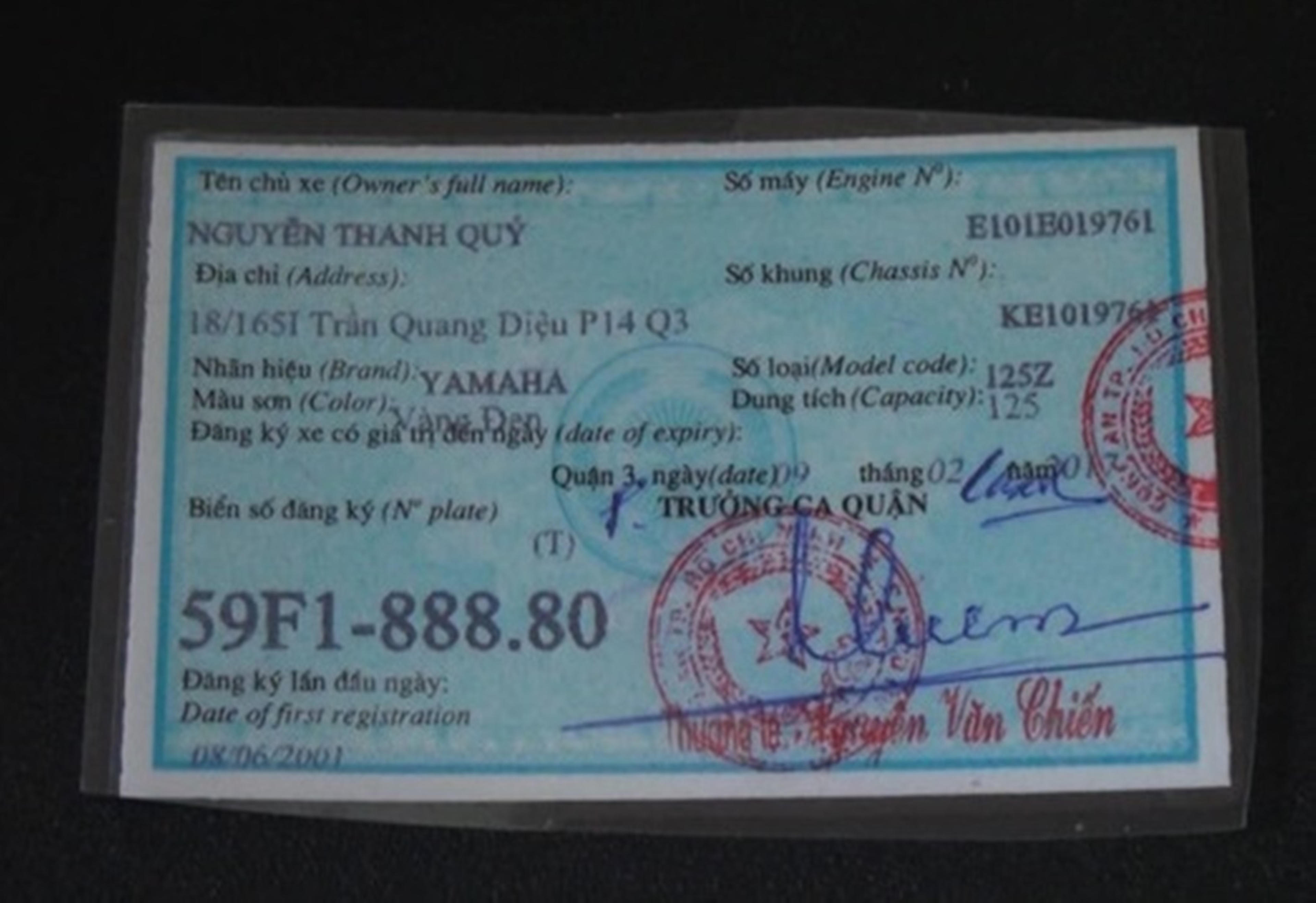 Khi có người mua xe, Hoàng yêu cầu khách hàng đặt tiền cọc và cung cấp thông tin cá nhân để làm biển số xe và giấy tờ xe. Hoàng đặt Lê Khắc Thông (28 tuổi, ngụ quận 7, TP.HCM) làm giả biển số và giấy tờ xe theo những thông tin mà Hoàng cung cấp.