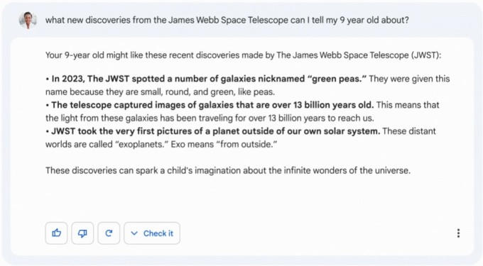 Đáp lại, Bard đưa ra ba gợi ý mà một đứa trẻ 9 tuổi có thể thích, trong đó có câu: "JWST đã chụp bức ảnh đầu tiên của một hành tinh ngoài hệ Mặt trời. Những thế giới xa xôi này được gọi là exoplanet".