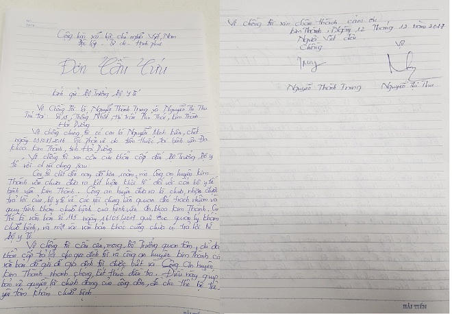 Vợ chồng tôi cầu cứu, mong Bộ trưởng quan tâm chỉ đạo khẩn cấp trả lời cho gia đình tôi và Công an huyện Kim Thành các văn bản đã gửi đi để gia đình tôi được biết và Công an huyện Kim Thành nhanh chóng kết thúc điều tra. Điều này giúp bảo vệ quyền lợi chính đáng của công dân, để cho thế hệ trẻ em yên tâm khám chữa bệnh”.