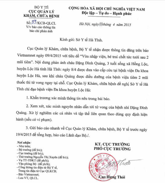 (PLO) - Chiều 9/4, Phó Cục trưởng Cục Quản lý Khám chữa bệnh (Bộ Y tế) Cao Hưng Thái đã ký Công văn số 383/KCB-QLCL, yêu cầu Sở Y tế Hà Tĩnh khẩn trương xác minh thông tin liên quan đến vụ cháu bé tử vong sau 2 mũi tiêm ở BV Đa khoa Lộc Hà.