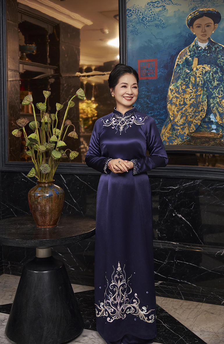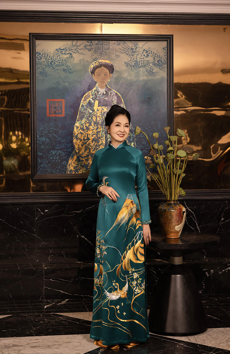 Luôn ấp ủ đam mê tạo nên những tác phẩm vẹn nguyên “giá trị vàng son”, NTK Trần Hoa Linh đã đưa những biểu tượng đặc trưng trong văn hóa Việt lên tà áo dài truyền thống: Ruộng bậc thang mùa vàng, bông sen thanh cao, chim hạc báo tin vui... như một lời chúc phúc, một lời khẳng định cho tình yêu và hạnh phúc.