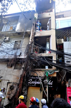 Tại hiện trường, cây cột điện có dây cáp chằng chịt bị cháy đen. Lửa cháy từ cây cột điện này đã lan sang 2 nhà bên cạnh khiến phần kính tòa nhà 4 tầng số 1 phố Triều Khúc bị vỡ vụn. Khói đen bao phủ cả 2 ngôi nhà.