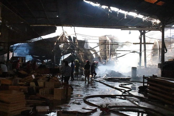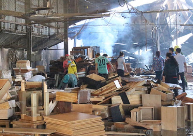 Lúc này, hàng trăm công nhân đang làm việc thì phát hiện khói lửa bốc lên từ khu vực chứa gỗ thành phẩm. Mọi người cùng nhau dập lửa tại chỗ nhưng bất thành.