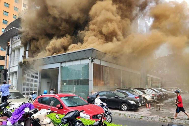 Đám cháy khởi phát từ phía sau toà nhà, khói bốc ra nhiều từ hầm và tầng 1. Nhận tin báo cháy, lực lượng Cảnh sát PCCC lập tức điều 5 xe chuyên dụng cùng nhiều cán bộ chiến sĩ đến hiện trường dập lửa.