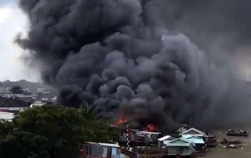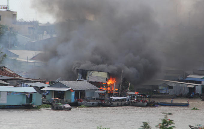 Ngọn lửa bùng phát dữ dội, bao trùm nhiều nhà dân cạnh chợ nổi, nhiều tàu thuyền đang buôn bán chặt dây neo tháo chạy.