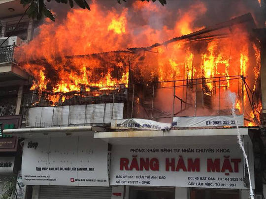 Lửa đỏ rực trong nhà và bao trùm mặt tiền tầng 2 của cả 2 căn nhà cao tầng liền nhau, trong đó có một căn là Phòng khám Răng Hàm Mặt. Khói bốc cao hàng mét, trùm không gian một đoạn phố Bát Đàn.