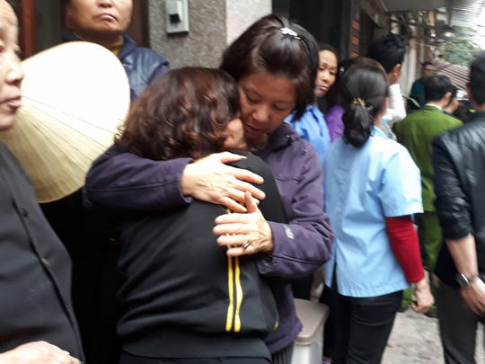 | Người phụ nữ được cho là người nhà của người bị kẹt trong ngôi nhà cháy đang khóc. Ảnh: Người lao động. |