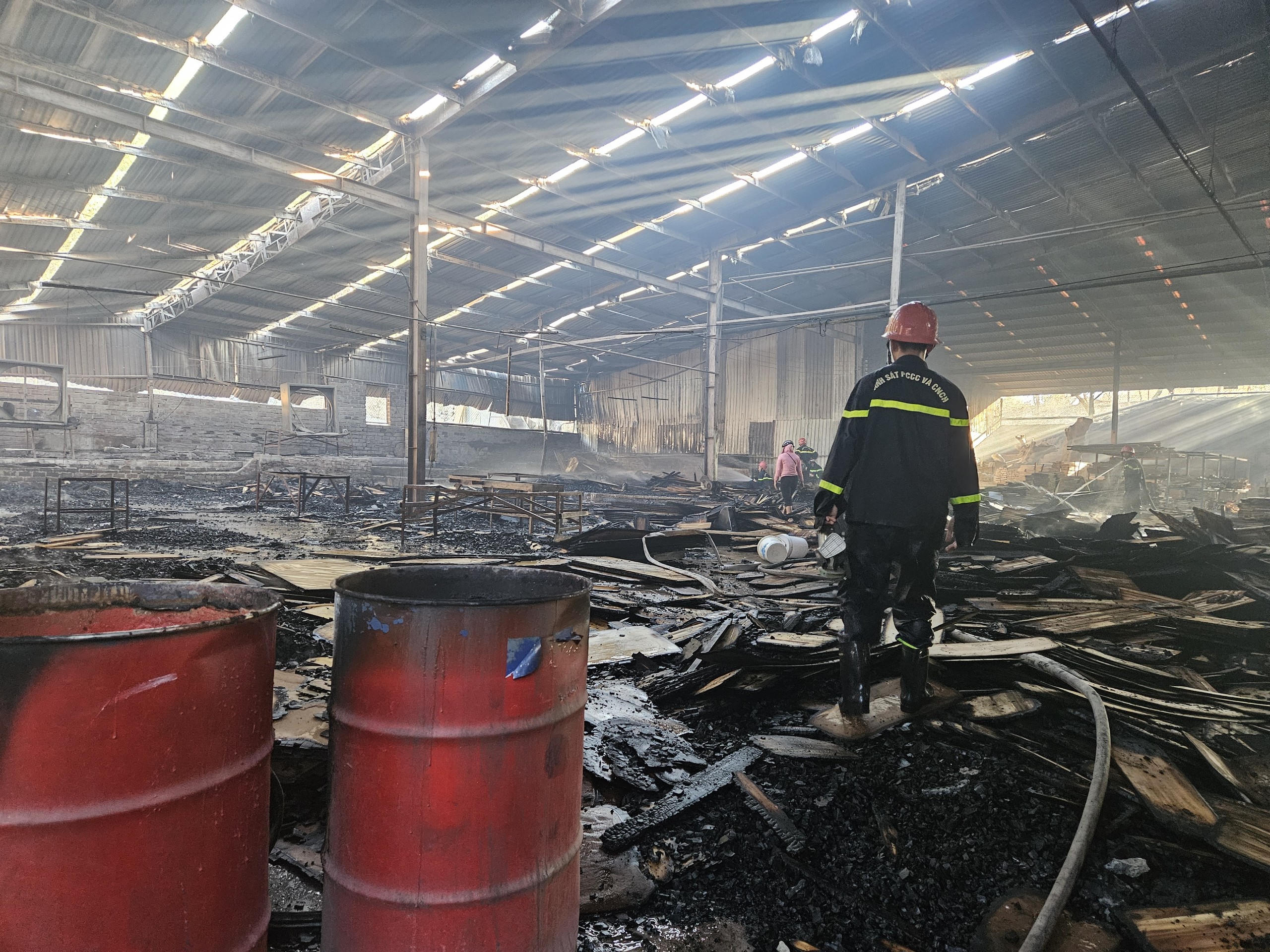 Mặc dù đám cháy tại khu vực nhà xưởng cơ bản đã được dập tắt nhưng lửa đã lan sang khu vực rừng keo phía sau xưởng.