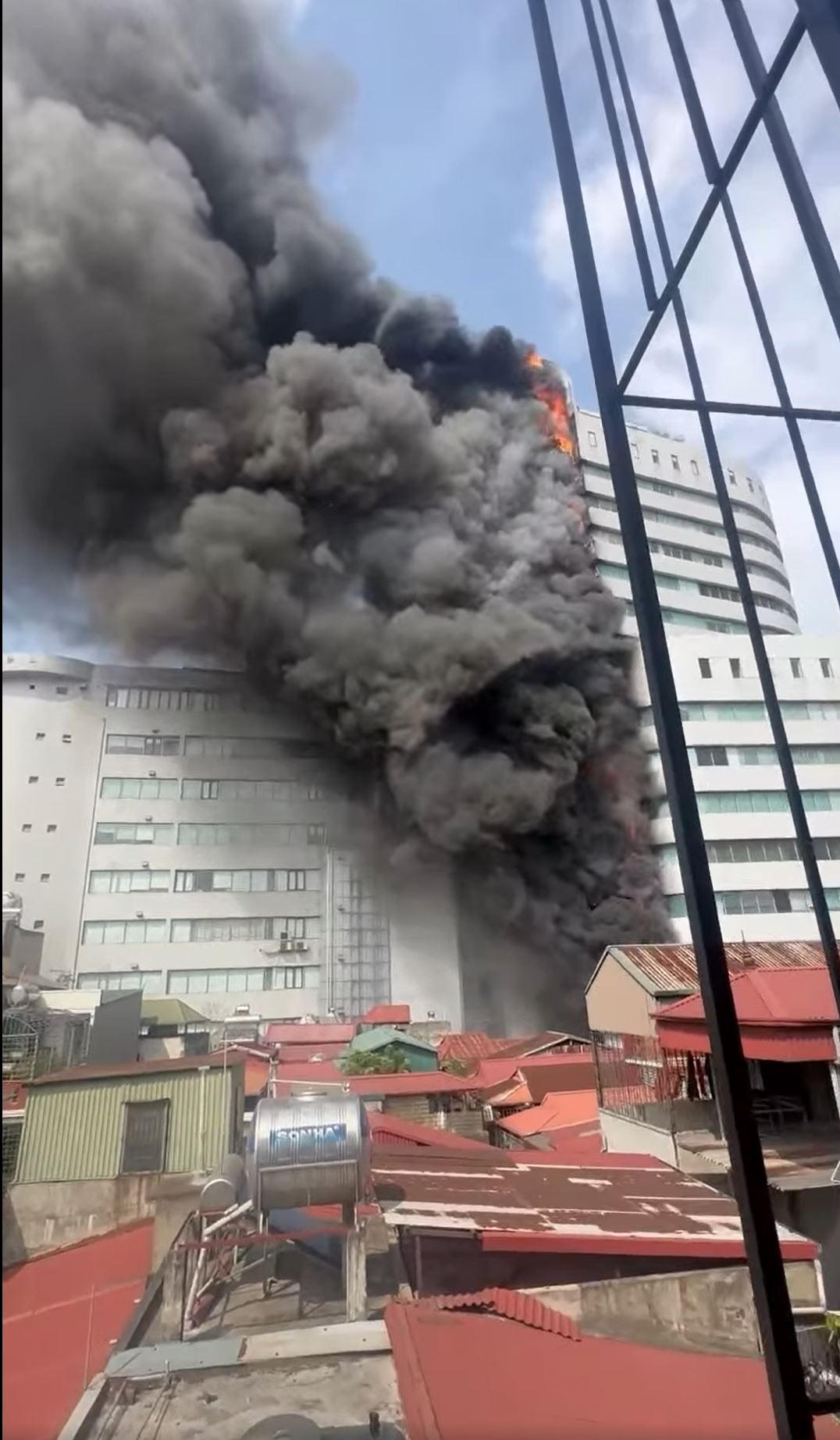Ngọn lửa bùng phát và lan rộng theo trục của toà nhà, cột khói bốc cao hàng chục mét tại khu vực trên tầng cao của toà nhà.