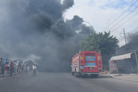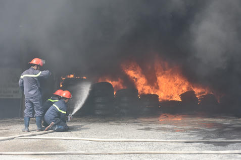 Nhận được tin báo, Phòng Cảnh sát PCCC số 1 và số 2, thuộc Cảnh sát PCCC tỉnh đã huy động nhiều xe chữa cháy cùng hàng chục cán bộ, chiến sĩ tới dập lửa. Nơi xảy ra cháy có nhiều vật liệu dễ cháy như vỏ xe, thùng xốp… lại gặp gió lớn nên công tác chữa cháy gặp nhiều khó khăn.