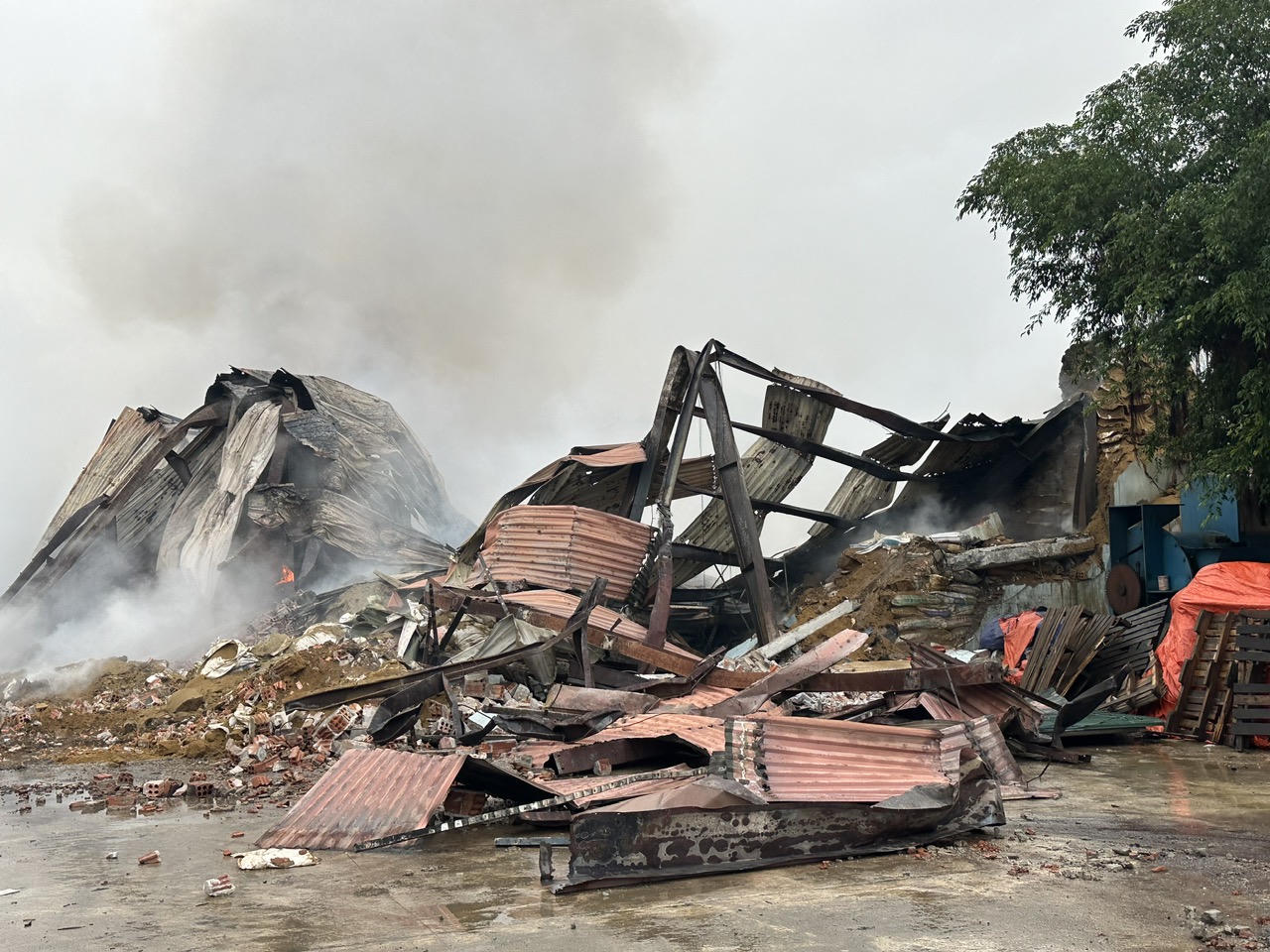 Vụ cháy đã làm nhà xưởng khung thép mái tôn, tường xây gạch diện tích khoảng 1.755m2 đổ sập.