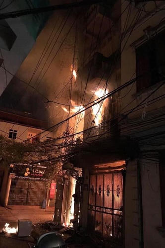 Ngôi nhà bị cháy là cửa hàng kinh doanh nằm sâu trong ngõ, lửa thiêu rụi mọi đồ đạc từ tầng một đến tầng bốn. Các mảng vữa bong tróc và ám màu đen của khói. Nhiều xe máy cùng vật dụng cũng bị cháy.