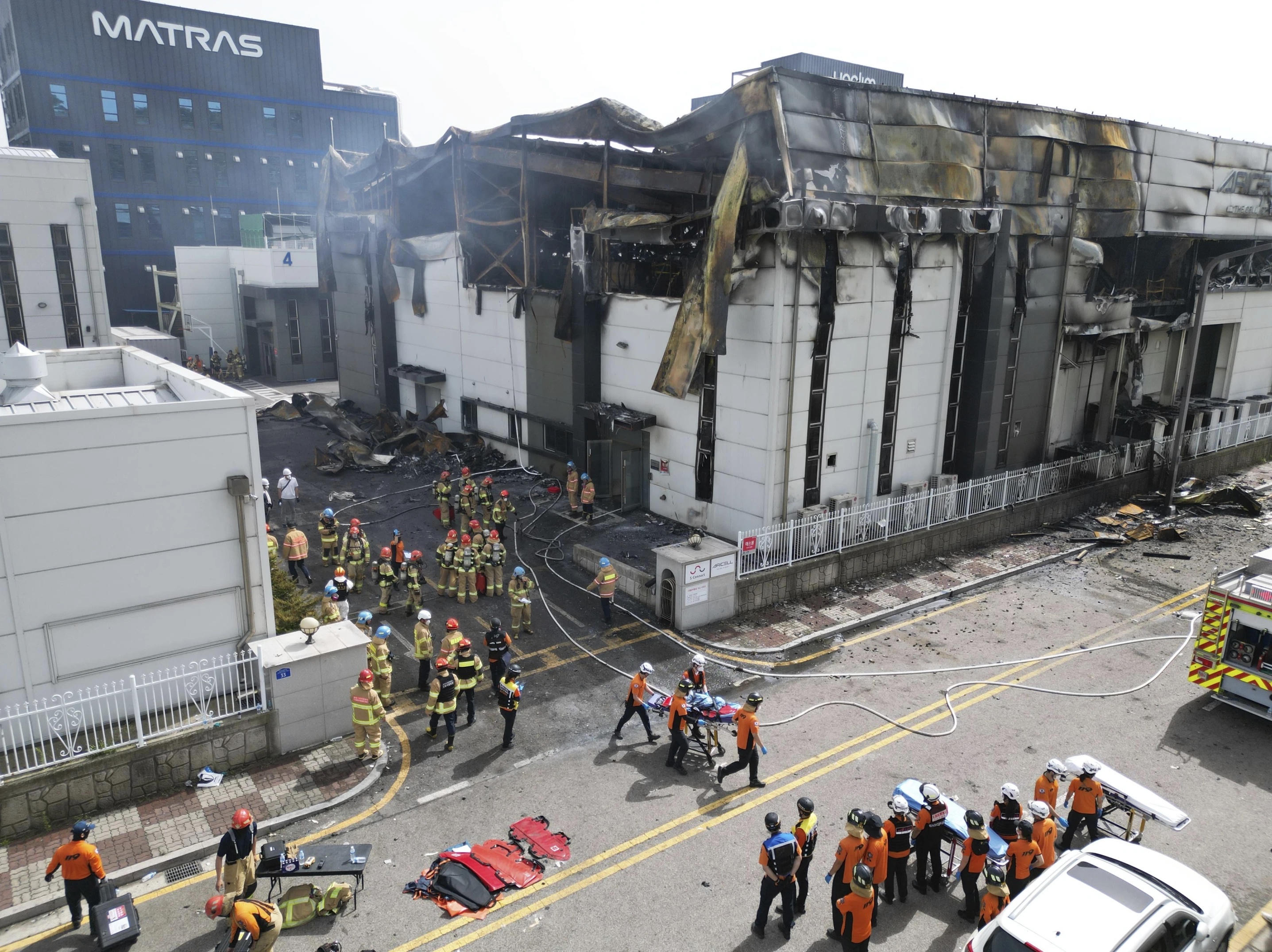 | Hỏa hoạn xảy ra vào khoảng 10h30 (giờ địa phương) ngày 24/6 tại nhà máy sản xuất pin lithium ở thành phố Hwaseong, tỉnh Gyeonggi, khi 102 người đang làm việc. Ảnh: Hong Ki-wonj/Yonhap. |