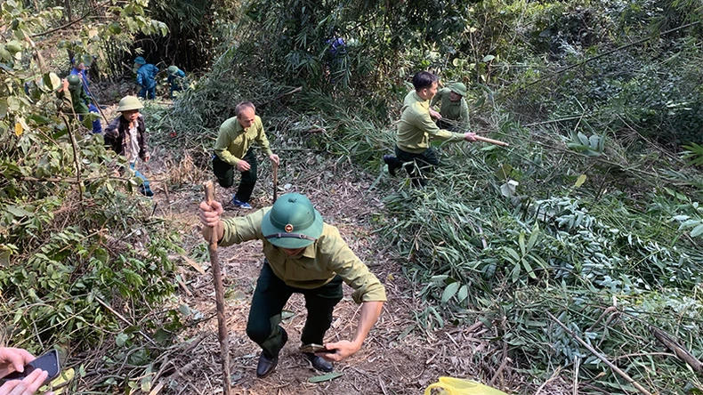 Các lực lượng cùng người dân làm đường băng ngăn đám cháy lan rộng. (Ảnh: Báo Nhân dân) |
