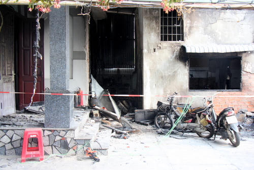 Tại hiện trường, 3 chiếc xe máy, tiệm chất đầy đồ điện tử bị thiêu rụi. Căn nhà hai tầng của người chủ bị cháy, hư hỏng đồ đạc trong phòng khách, khói ám đen.