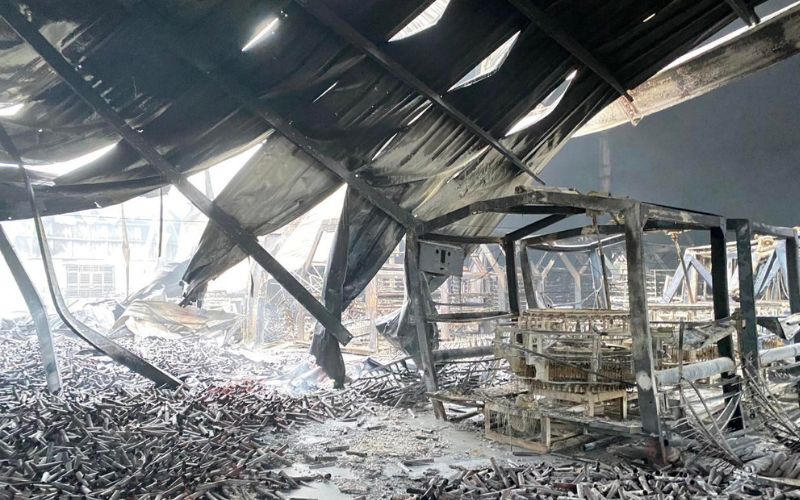 | Đám cháy đã thiêu rụi toàn bộ nhà xưởng sản xuất bao bì rộng hàng nghìn m2. Ảnh: Công an tỉnh Hòa Bình. |