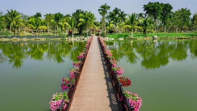 Ngoài ra, khi nhắc đến Ecopark, không thể không nhắc đến cây cầu phao gỗ tuyệt vời bắc ngang Hồ Thiên Nga. Trong những thước phim nói về Ecopark đều có hình ảnh của cây cầu phao gỗ đặc biệt này, với hai hàng hoa chạy dài bên thành cầu tạo nên khung cảnh lãng mạn.