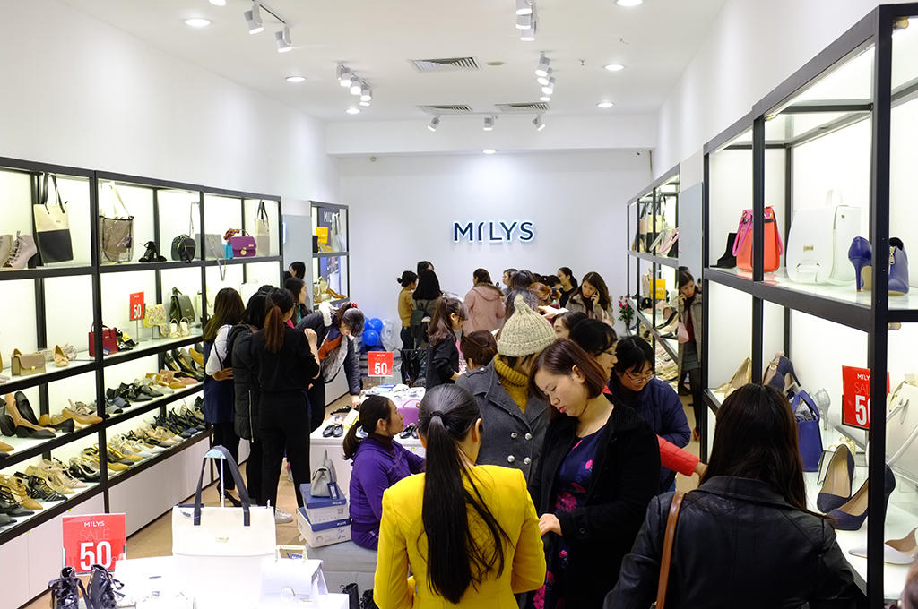 Ngay tại tầng 1, gian hàng giày Milys chật kín khách hàng. Các mẫu giày, sandal của Milys tinh tế, sang chảnh, hợp với công sở, dự tiệc, dạo phố đang được giảm giá kịch trần lên tới 70%, từ nguyên giá 790.000 chỉ còn 249.000 đồng/đôi nên được nhiều chị em săn lùng nhân dịp khuyến mãi hiếm có trước Tết Mậu Tuất này.