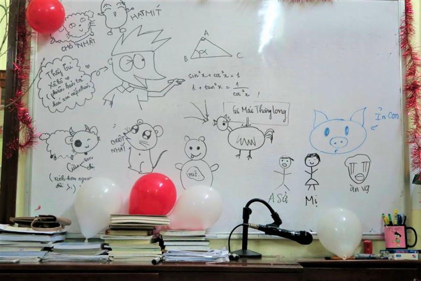 | Bảng trắng thường được các học sinh vẽ hình ngộ nghĩnh để ghi dấu ấn cá nhân, viết lời chúc, lời trêu đùa |