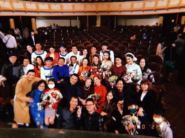 Các nghệ sĩ chụp ảnh với vợ của cố tác giả Vũ Đình Long sau buổi diễn |