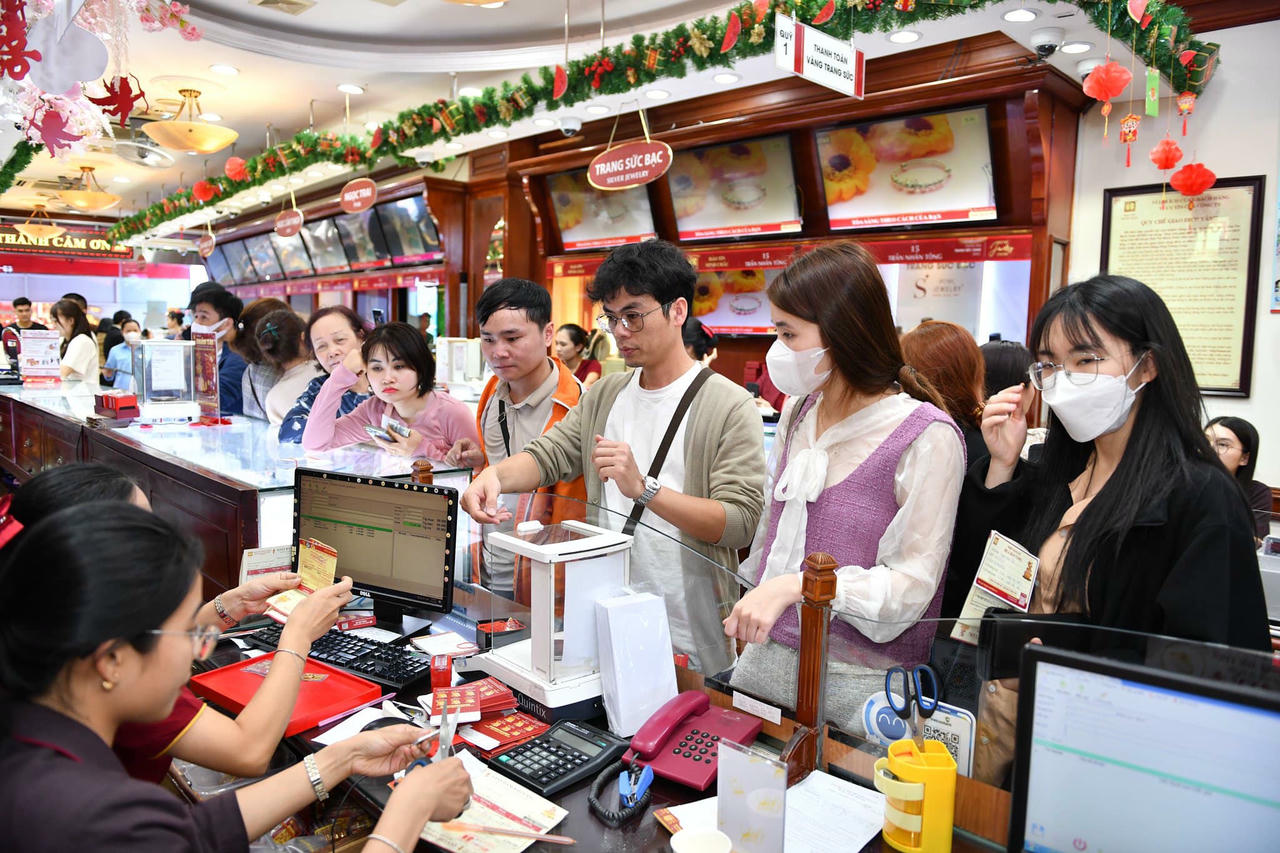 Tại cửa hàng Bảo Tín Minh Châu trên đường Trần Nhân Tông, Hai Bà Trưng (Hà Nội), từ trong quầy thu ngân, quầy bán hàng đến bên ngoài khu check in, khu xếp hàng đều chật kín người mua hàng.