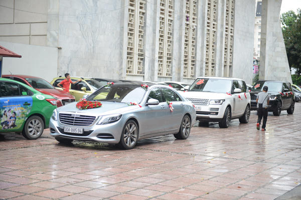 Đoàn xe chở cô dâu chú rể có mặt ở Cung Văn hóa Hữu Nghị Hà Nội từ 16h chuẩn bị cho tiệc cưới vào tối 10/9. Trời thủ đô đổ mưa từ đầu giờ chiều nhưng tới gần hôn lễ, mưa tạnh, thời tiết mát mẻ. |