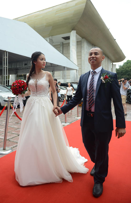 Chú rể Chí Anh nhanh chóng xuống xe mở cửa đón cô dâu Khánh Linh. |