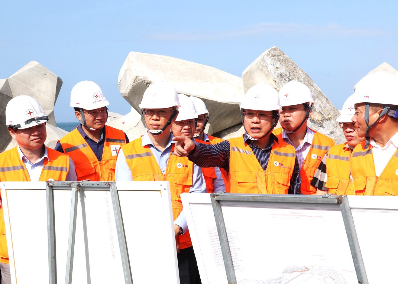 Phó Chủ tịch Hồ Sỹ Hùng và lãnh đạo Ban Quản lý dự án điện 2 kiểm tra khu vực đê chắn sóng. |