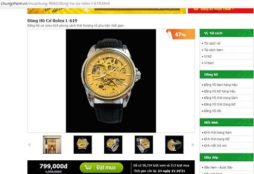 Trên trang web khác như chungnhom.vn, một chiếc đồng hồ có nhãn hiệu sang trọng Rolex được bán với mức giá 799.000 đồng, rẻ hơn rất nhiều so với giá bán hàng chính hãng. Tại trang web này cũng bán vô số các mặt hàng túi xách, kinh mắt hàng hiệu với giá “rẻ như bèo”.