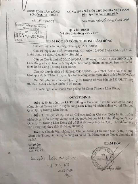 Thuận theo văn bản trên, ngày 19/7/2016, Sở Công thương có quyết định điều động viên chức - bà Lê Thị Hằng đang công tác tại Trung tâm Khuyến công Lâm Đồng (lúc này bà Hằng vẫn đang làm việc tại Chi cục QLTT Lâm Đồng – PV) về nhận nhiệm vụ tại Chi cục QLTT; tiền lương và mọi chế độ, quyền lợi của bà Hằng do Chi cục QLTT Lâm Đồng chi trả theo hệ số lương 3,00.