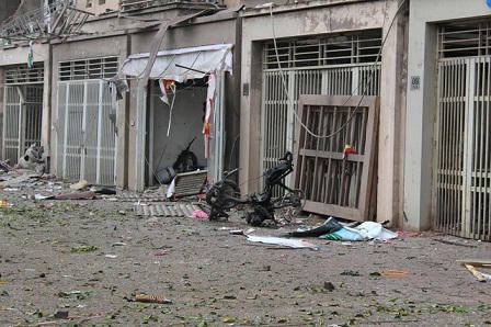 Thông tin ban đầu, chủ nhà kinh doanh sắt vụn đã thiệt mạng trong vụ nổ kinh hoàng. Trước thời điểm xảy ra vụ nổ, một người đàn ông mang một vật liệu nổ ra vỉa hè và tiến hành cưa. Sau đó vật liệu này phát nổ, tạo thành một hố sâu khoảng 2m, rộng khoảng hơn 2m. Hiện chưa xác định được loại vật liệu nổ nào gây ra vụ nổ này. Sơ bộ thiệt hại trực tiếp thống kê được là 36 căn hộ. Vụ nổ lớn tới mức đứng cách đó 2km vẫn có thể nghe rất rõ.