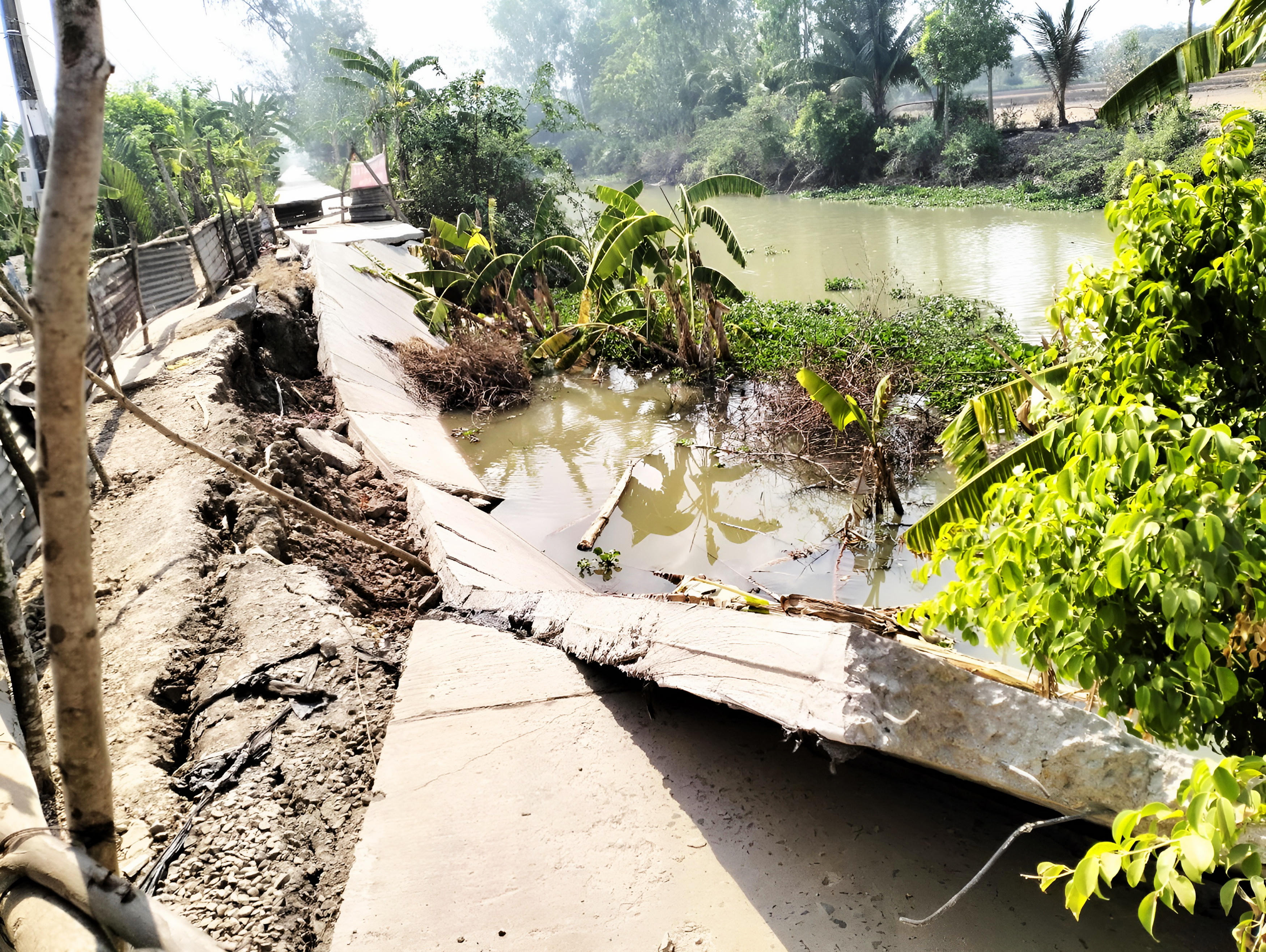Vụ sạt lở trên địa bàn ấp Chắc Đốt, xã Châu Hưng A, huyện Vĩnh Lợi, làm 30m đường bê tông sụp lún xuống sông vào ngày 16/4. |