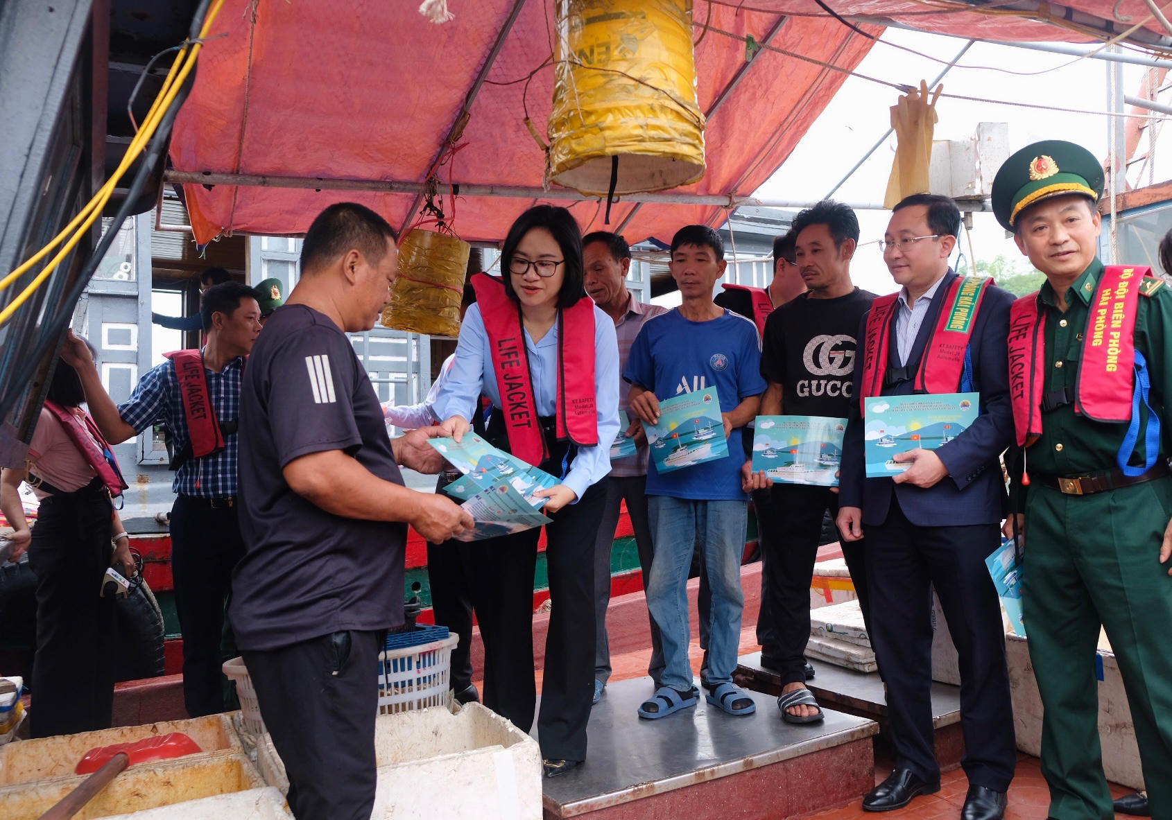 Trưởng phòng PBGDPL Lưu Thị Thu Huyền phát tờ gấp tuyên truyền phòng, chống khai thác IUU cho ngư dân tại cảng cá Trân Châu, huyện Cát Hải. |