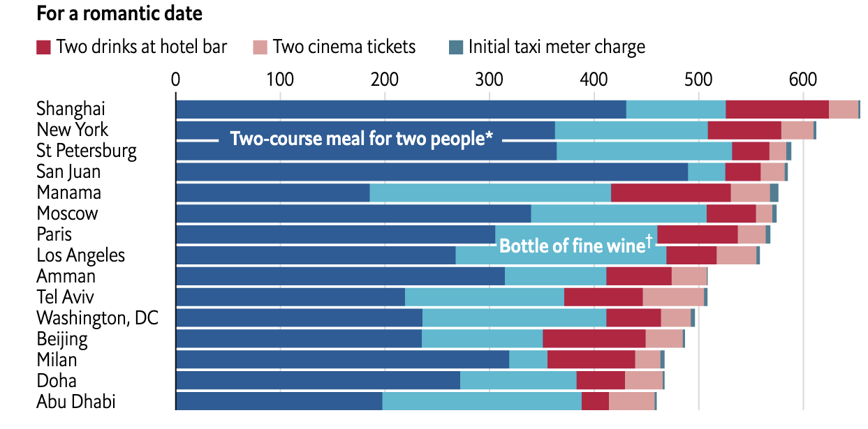 Tờ The Economist thông tin về khảo sát của công ty EIU về giá cả 350 mặt hàng tại 173 thành phố trên toàn cầu. EIU đã tổng hợp hóa đơn một buổi hẹn hò lãng mạn nhân dịp Valentine tại các thành phố này. Hóa đơn bao gồm đồ uống tại một khách sạn sang trọng, bữa tối, vé xem phim, taxi và một chai rượu vang.