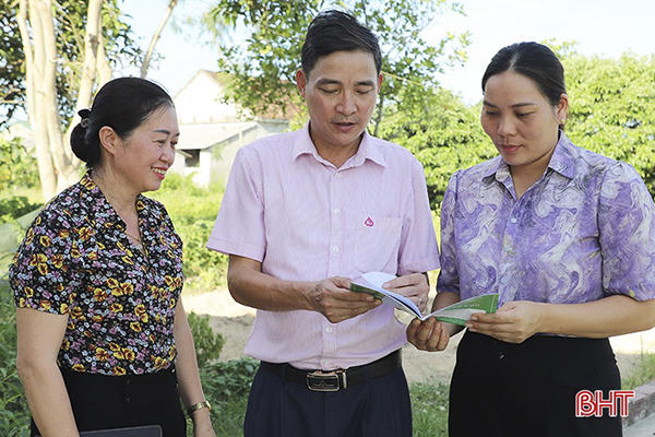 Cán bộ NHCSXH huyện Thạch Hà kiểm tra mục đích sử dụng vốn tại xã Nam Điền. ( (Ảnh Thu Phương) |