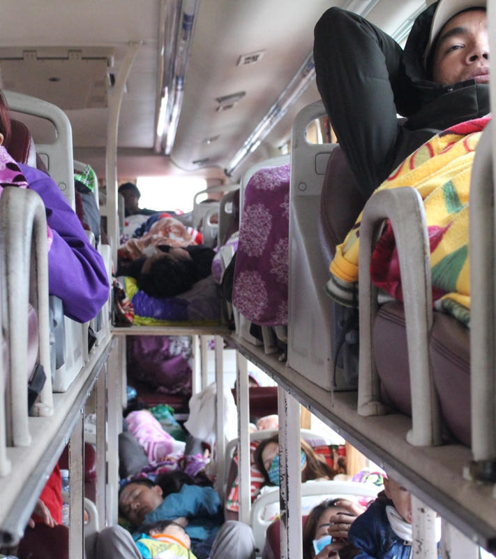 | Nhà xe Thọ Lam đã nhồi nhét khách chật cứng trên 2 lối đi dưới sàn và kê thêm thành trên tầng 2 cho khách. |