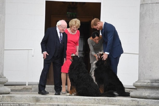 Trong ngày thứ 2 tại Ireland, vợ chồng Công tước xứ Sussex tới thăm dinh thự chính thức của Tổng thống Michael D Higgins. Xuất hiện trong trang phục đầm xám của nhà thiết kế Roland Mouret, Công nương Meghan Markle quay trở lại với kiểu tóc búi cổ điển.