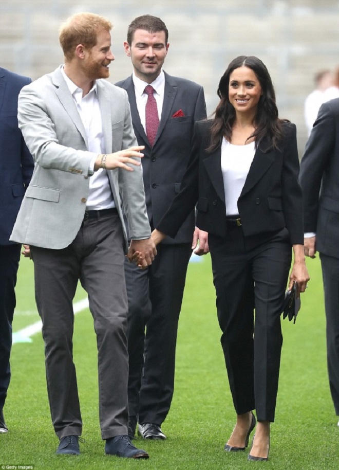 Cùng ngày, vợ Hoàng tử Anh thay đổi phong cách khi khoác lên người bộ suit đen thanh lịch khi tham gia lễ hội thể thao Gaelic tại công viên Croke. Bộ suit đến từ thương hiệu Givenchy này có giá 2.500 bảng Anh. Để tô điểm cho set đồ, Công nương Meghan Markle dùng thắt lưng da đen 310 bảng Anh, giày cao gót Sarah Flint 268 bảng Anh và clutch cầm tay Givenchy 1.690 bảng Anh.