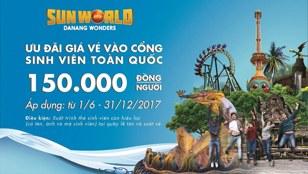(PLO) -Từ ngày 1/6/2017-31/12/2017, Sun World Danang Wonders (Asia Park) sẽ giảm 50% giá vé vào cửa cho toàn bộ sinh viên đang theo học các trường Đại học, cao đẳng, trung cấp trên toàn quốc.