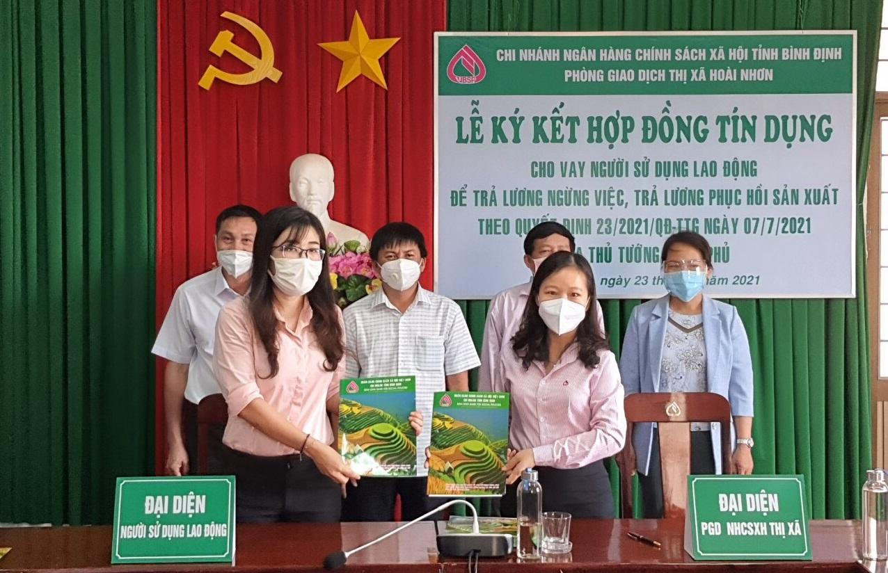 (PLVN) - Từ ngày 23/7 đến nay, Chi nhánh Ngân hàng Chính sách xã hội (NHCSXH) tỉnh Bình Định, các Phòng giao dịch NHCSXH cấp huyện đã ký kết hợp đồng tín dụng cho vay người sử dụng lao động để trả lương ngừng việc, trả lương phục hồi sản xuất theo Quyết định 23/2021/QÐ-TTg với 13 doanh nghiệp.