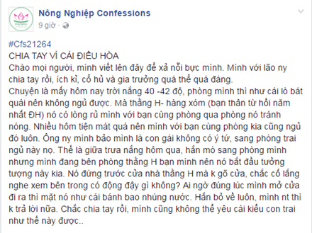 Cụ thể, trên trang Confessions của trường Học viện Nông nghiệp Việt Nam đã chia sẻ câu chuyện đôi bạn trẻ chia tay chỉ vì người yêu đi ngủ nhờ phòng có điều hòa trong ngày nắng nóng.