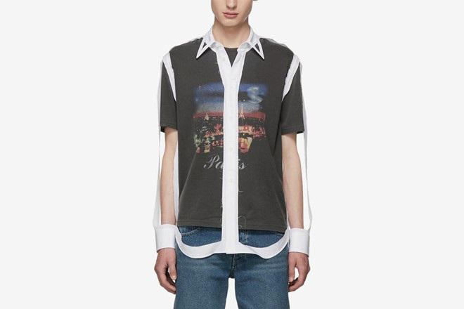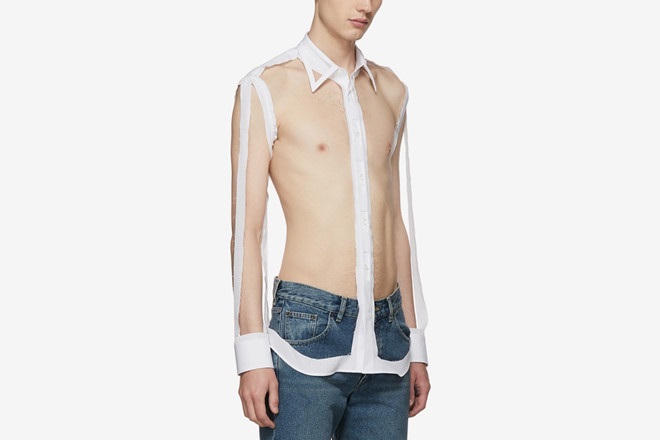 Mẫu áo sơ mi độc đáo được làm từ chất liệu vải xuyên thấu với những đường viền sắc trắng độc đáo. Các tín đồ thời trang đánh giá sản phẩm có phần dị biệt, cũng như được xếp vào danh sách những thiết kế táo bạo nhất của phái mạnh trong năm 2018.
