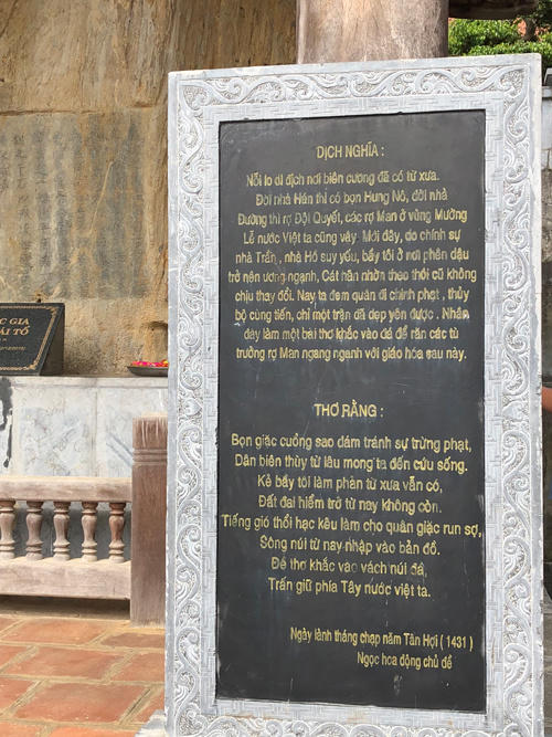 Bài thơ trên của vua Lê được khắc trên một khối đá nặng 15 tấn tồn tại gần 600 năm qua. Văn bia đã được công nhận là di tích lịch sử cấp quốc gia vào năm 1981, công nhận là Bảo vật quốc gia vào năm 2016.