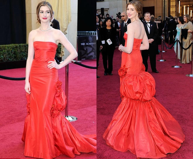 Là nàng thơ lâu năm của nhà thiết kế Valentino, Anne Hathaway chi 80.000 USD (gần 1,8 tỷ đồng) cho chiếc đầm đỏ ở Oscar 2011. Cộng trang sức kim cương "Lucinda" của hãng Tiffany & Co, bộ cánh của nữ diễn viên lên đến 10 triệu USD (hơn 223 tỷ đồng).