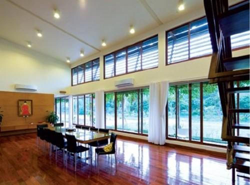 Các căn phòng sinh hoạt chung của khu biệt thự đều được ốp kính để đón ánh sáng tự nhiên thay vì xây kín.